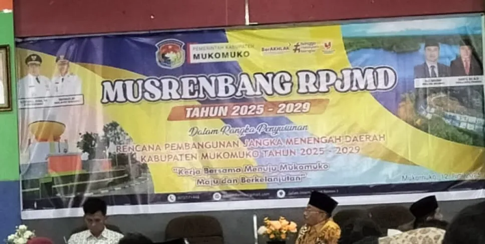 Musrenbang RPJMD Kabupaten Mukomuko yang mengusung tema "Kerja Bersama Menuju Mukomuko Maju dan Berkelanjutan", digelar di Aula Bappelitbangda Kabupaten Mukomuko, Kamis (12/6/2025). Acara ini dibuka langsung oleh Bupati Mukomuko, Choirul Huda, dan turut dihadiri oleh Gubernur Bengkulu yang diwakili oleh Asisten II Setda Provinsi Bengkulu, R.A. Denni.