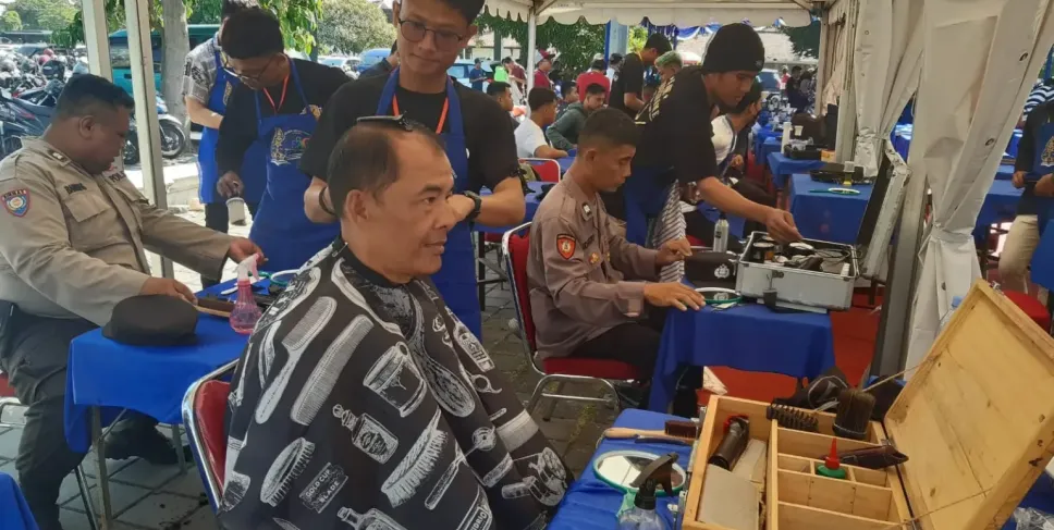 SiberBengkulu.co, Solo- Tukang cukur memotong rambut warga pada Pesta Cukur Rambut Gratis se-Indonesia di Mangkunegaran, Solo, Jawa Tengah, Minggu (28/5/2023). Pesta cukur rambut gratis yang digelar secara daring oleh Ikatan Istri Karyawan dan Karyawati (Ikawati) Kementerian Agraria dan Tata Ruang/Badan Pertanahan Nasional (ATR/BPN) tersebut untuk memecahkan rekor Museum Rekor Indonesia (MURI) dengan cukur rambut terbanyak yang melibatkan 1.120 kapster dan peserta cukur rambut terbanyak yang ditargetkan mencapai lima ribu orang.