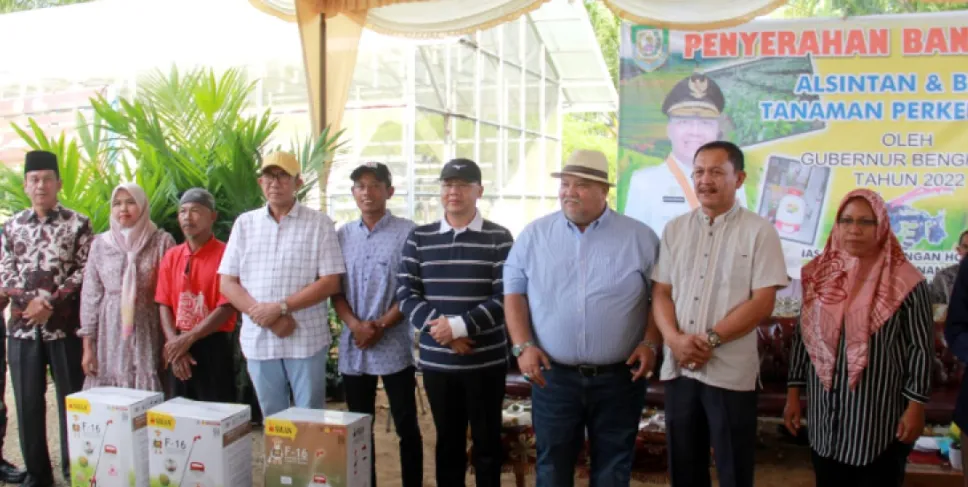 Bengkulu, Siberbengkulu.co - Tingkatkan produktivitas komoditas perkebunan, Gubernur Bengkulu Rohidin Mersyah menyerahkan bantuan Alat dan Mesin Pertanian (Alsintan) dan Bibit Tanaman Perkebunan. Di antaranya adalah bibit Pala dan bibit Kelapa Sawit kepada Kelompok Tani di Kecamatan Pino Raya Kabupaten Bengkulu Selatan, juga perwakilan Kelompok Tani Kabupaten Kaur, dengan total 22.000 bibit dan 15 Hand Sprayer, Sabtu (6/8/2022).