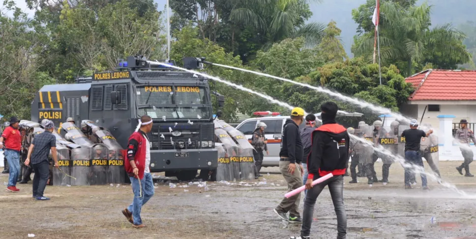 Lebong, Siberbengkulu.co -- Polres Lebong Polda Bengkulu menggelar simulasi Sispam Kota dalam rangka pengamanan Pemilu 2024. Kegiatan tersebut berlangsung di Lapangan Pendopo Rumah Dinas Bupati Lebong, Selasa (24/10/2023) pagi.