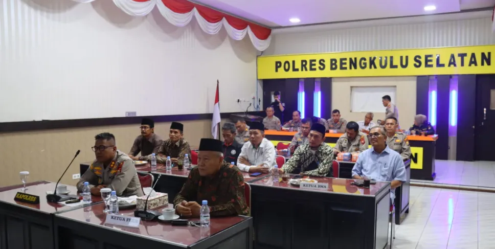 Bengkulu Selatan, SiberBengkulu.co - Kapolres Bengkulu Selatan Akbp Florentus Situngkir SIK bersama PJU Polres Bengkulu Selatan serta tokoh masyarakat diantaranya Ketua FKUB,Ketua BMA ,Ketua MUI, Ketua NU, Ketua Muhaddiyah dan perwakilan pendeta serta tokoh pemuda Ketua KBPP POLRI serta Ketua Organisasi Pemuda Kutau ,turut mengikuti zoom meeting di Aula Commen Center Polres Bengkulu Selatan Polda Bengkulu, Rabu ( 21/06/23).