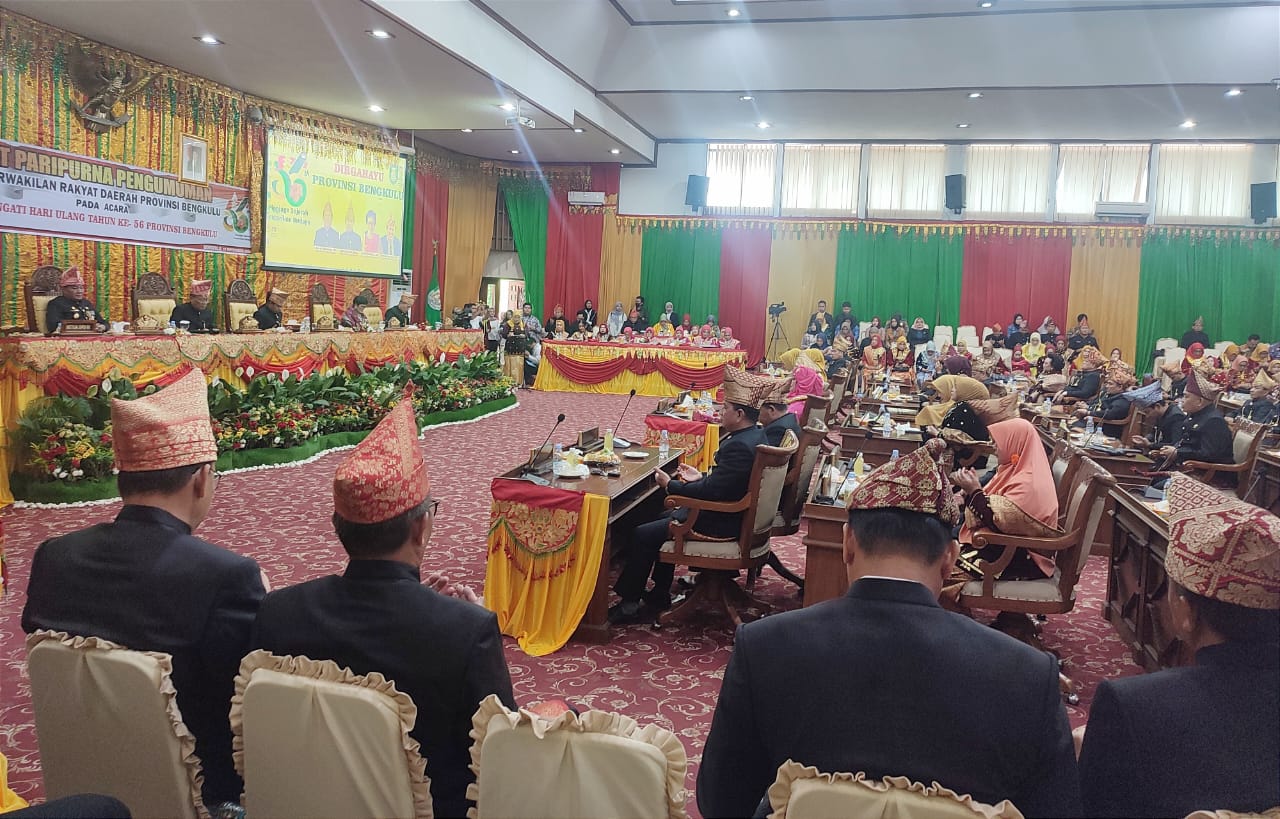 Rapat Paripurna ini dipimpin oleh Ketua DPRD Provinsi Bengkulu, Sumardi, dan dihadiri oleh Pelaksana Tugas (Plt) Gubernur Bengkulu Rosjonsyah, Ketua DPD RI Sultan Bachtiar Najamudin, unsur Forkopimda Provinsi, perwakilan instansi vertikal, serta pejabat dan ASN di lingkungan Pemerintah Provinsi Bengkulu.