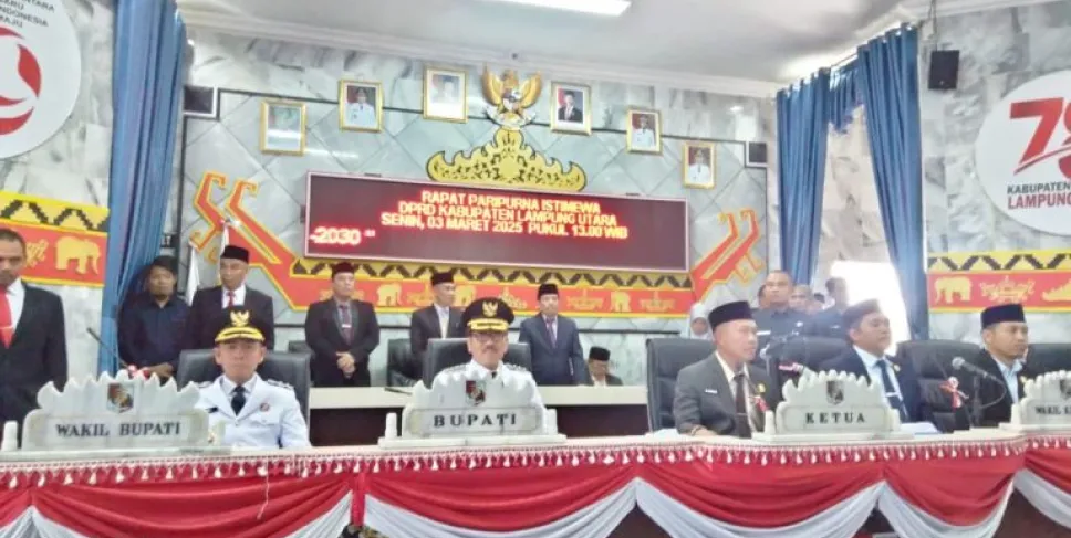 Rapat paripurna istimewa pidato Bupati dan Wakil Bupati Kabupaten Lampung Utara, Dr. Ir. H. Hamartoni Ahadis, M. Si, dan Romli, S. Kom, SH, MH, periode 2025-2030 itu berlangsung di Gedung DPRD setempat pada, Senin 3 Maret 2025.