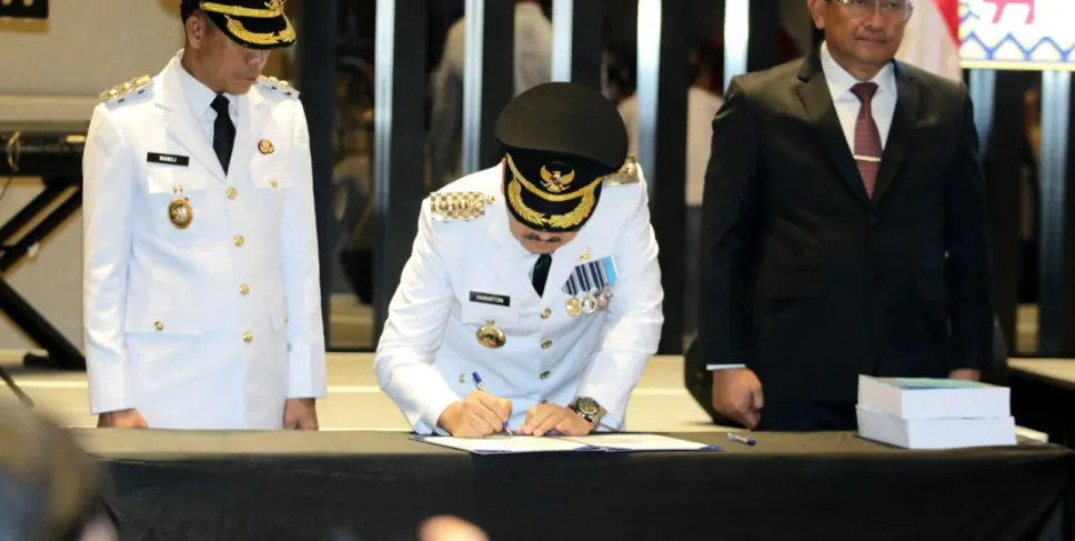 Jakarta, Siberbengkulu.co -- Proses Serah Terima Jabatan (Sertijab) Bupati Lampung Utara berlangsung penuh khidmat pada Kamis (20/2/2025) di Hotel Movenpick, Jakarta Pusat. Acara ini menyaksikan peralihan jabatan dari Pj. Bupati Drs. H. Aswarodi, M.Si., kepada Bupati terpilih Dr. Ir. H. Hamartoni Ahadis, M.Si., dan Wakil Bupati Romli, S.Kom., S.H., M.H. Prosesi penting ini dipimpin langsung oleh Gubernur Lampung, Rahmat Mirzani Djausal, S.T., M.M.
