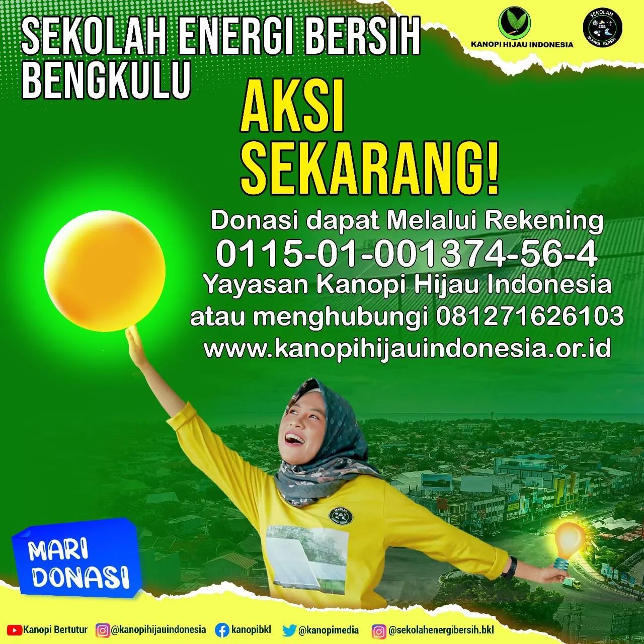 Selain mengumpulkan donasi untuk sumber energi bersih terbarukan, Kanopi Hijau Indonesia lewat program SEB juga meningkatkan kesadaran kristis publik terutama bagi generasi muda tentang urgensi transisi energi berbentuk sosliasasi di SMA sint Carolus, SMA N 1 Kota Bengkulu, SMA N 4 Kota Bengkulu, SMA N 7 Kota Bengkulu, SMK N 2 Kota Bengkulu, SMK N 3 kota Bengkulu.
